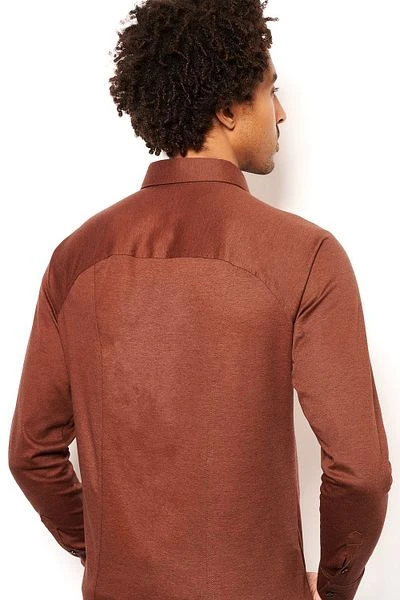 Het overhemd heeft een stijlvolle bruine kleur en is voorzien van lange mouwen en een enkele manchet. Verder is er een 1-knoops, kent boord aanwezig. De Slim-Fit pasvorm zorgt voor een getailleerde afwerking, waar u indien gewenst met gemak nog een T-Shirt onder kunt dragen. Ook erg handig: dit overhemd is volledig strijkvrij!