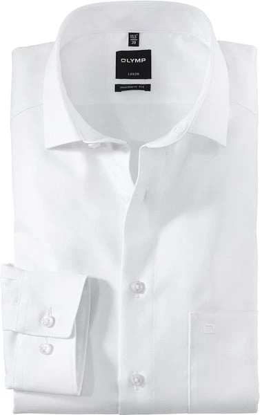 Met dit witgekleurde overhemd uit de Luxor Modern-Fit collectie van Olymp haal je een klassiek helder wit dress-shirt in huis. Het overhemd is afgewerkt met een traditionele kent boord, wat een moderne kraagvorm is voor een business-outfit. Deze is iets compacter dan de klassieke uitvoerig met enigszins verkorte kraagboorden. Hierdoor past deze kraag goed bij dassen met kleine tot middelgrote knoop. Daarnaast heeft het overhemd een borstzakje met een ton sur ton borduursel.