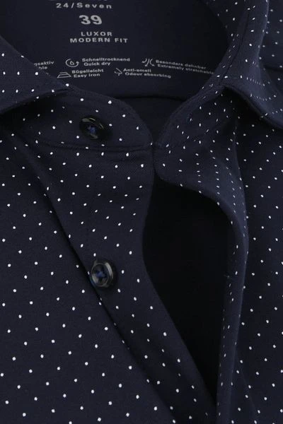 Het OLYMP 24/Seven-Dynamic-Flex-Jersey-All-Time-Shirt: comfortabel als een T-shirt, stijlvol als een overhemd. Het modische shirt heeft een stijlvolle donkerblauwe kleur met wit stippen en is gemaakt van een zachte, elastische en vormbestendige jersey binding. Daarnaast is het dress-shirt voorzien van een kent boord, enkele manchetten en bijpassende donkergekleurde knopen.