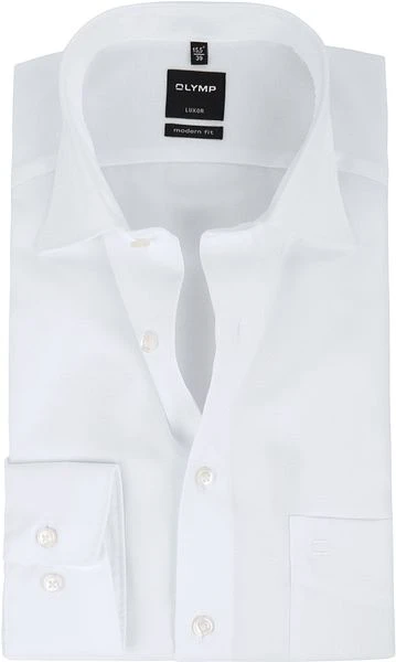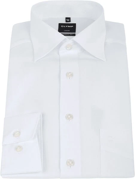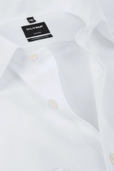 Kom modieus voor de dag met dit tijdloze witte OLYMP shirt in een licht getailleerde modern-fit pasvorm. De new kent boord maakt van dit overhemd een echt statement shirt. Dit OLYMP shirt is gemaakt van strijkvrij katoen, waardoor het licht en comfortabel draagt.Het overhemd is voorzien van een borstzak.Â