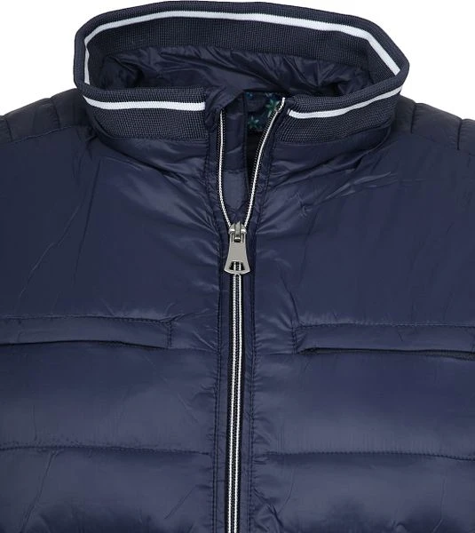 Met dit trendy jack van Suitable krijgt je outfit een sportieve uitstraling. De perfecte tussenjas voor de lente en herfst heeft een trendy donkerblauwe kleur met een gewatteerde look. Daarnaast is het Reno jack voorzien van twee steekzakken met rits, twee zakken met rits op de borst, een binnenzak. De opstaande kraag en de rits hebben een witte rand wat de jas een sportieve uitstraling geeft en is afgewerkt met het suitable merklogo op de mouw. De jas is aan de binnenzijde afgewerkt met een modieus bloemendessin.