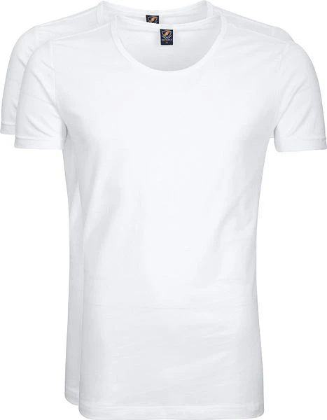 Het 2-pack T-shirts bevat twee shirts die gemaakt zijn van 95% fijn gekamd, biologisch katoen (150 grams) gemixt met 5% elasthaan (stretch). Daarnaast zijn de witte shirts bewerkt met een Soft Silk Finish, waardoor de stof heerlijk zacht en glad aanvoelt. De korte mouwen zijn voorzien van een gezoomde afwerking en de extra brede O-hals heeft een mooie smalle boord van 11mm. Verder zijn de T-shirts voorzien voor een langere body (lengte) voor extra draagcomfort.