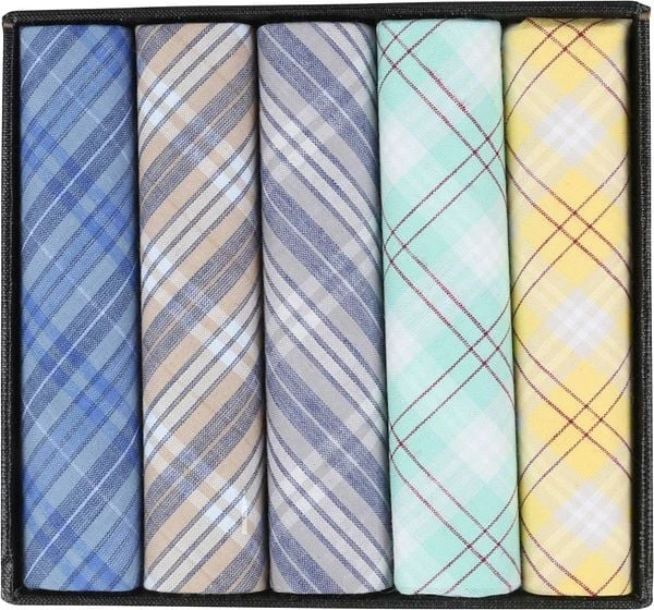 Luxe set met 5 herenzakdoeken met verschillende kleuren. De zakdoeken hebben allen een divers patroon en voelen comfortabel aan dankzij het zacht geweven katoen. De Hanky modellen hebben een afmeting van 40×40 cm.